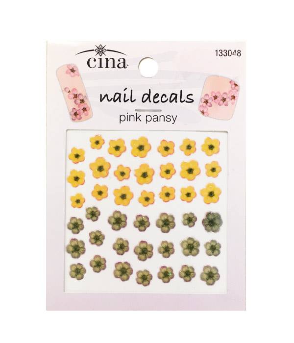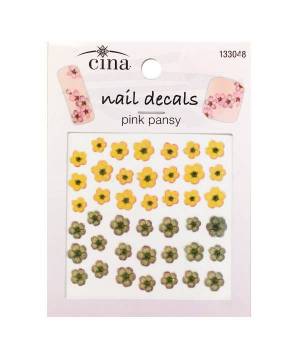 Nail Decals Pink Pansy.Beautiful floral design with yellow petals and green petals both with glitter .