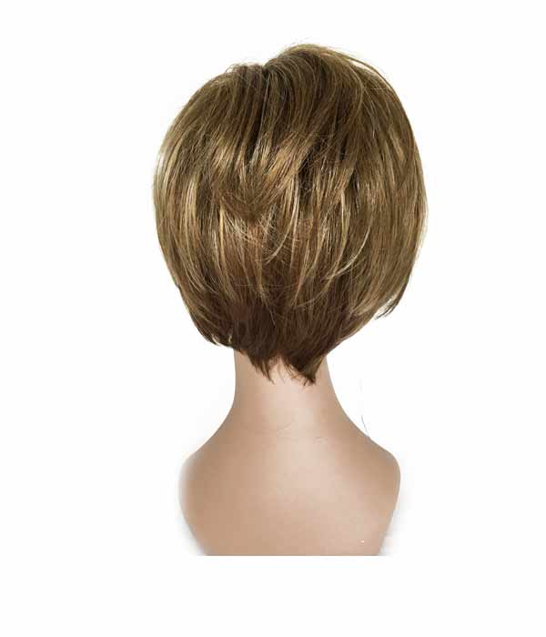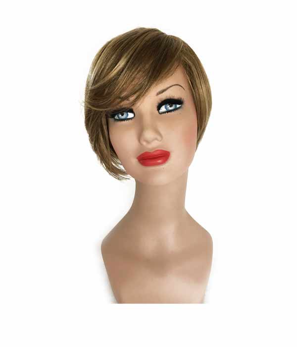Parrucca in fibra sintetica, colorazione Biondo Scuro. Lunghezza fino alle spalle con frangia. Lavorazione a macchina con elastici interni per la regolazione della misura.