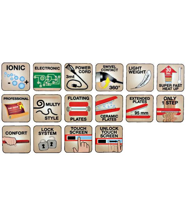 Resistenze ceramiche Fast Heat UP, pronta all’uso in meno di 30 secondi Placche Flottanti Ceramizzate. La ceramizzazione della piastra muster dona lucentezza ai capelli, idrata e ne riduce l’effetto elettrostatico Placche Ceramizzate Effetto Ioni Negativi.