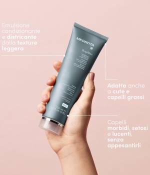 Modo d'uso: Dopo la detersione con lo shampoo Medavita prescelto, eliminare l’acqua in eccesso e applicare l’emulsione su cute e lunghezze. Pettinare e risciacquare con cura.