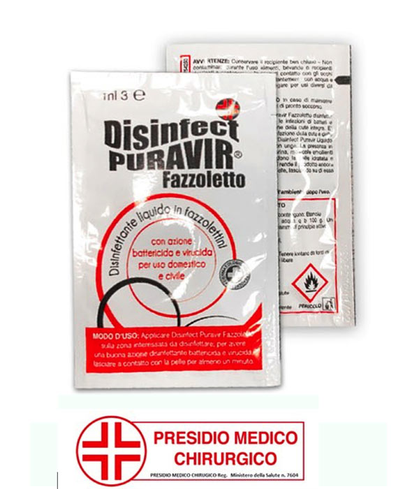 Disinfect Puravir Fazzoletto disinfetta rapidamente la cute prevenendo le infezioni da batteri e virus. E' indicato per la disinfezione della cute integra.