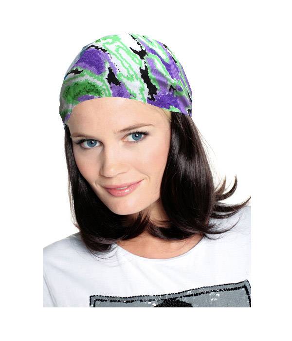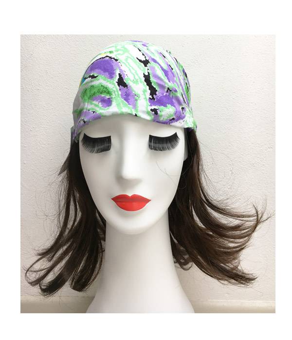 Bandana Banana model patterned application with synthetic hair. With elastic inner inside the bandana on the back.