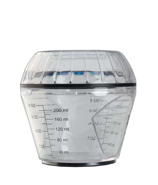 Three-in-one measuring cup, shaker and bowl, with a sealing gasket and anti-slip ring.