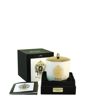 Candle in white glass with gold lid and decoration, Wood-Gold Rose Oudh wick