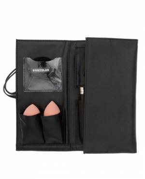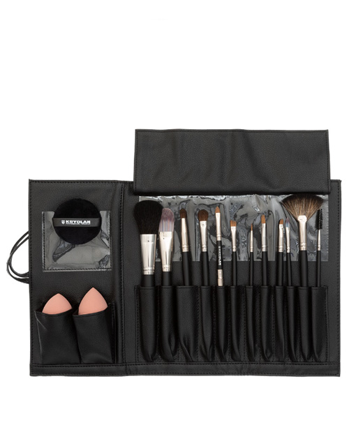 A set of professional brushes consisting of 15 pieces and a practical bag made of vegan leatherette. The brushes are made with a matt black real wood handle and a classic aluminum ferrule.