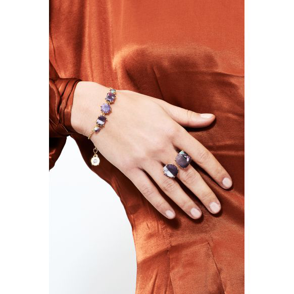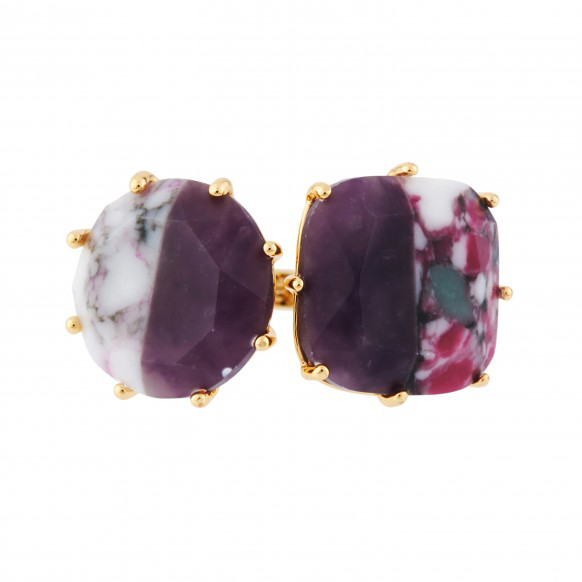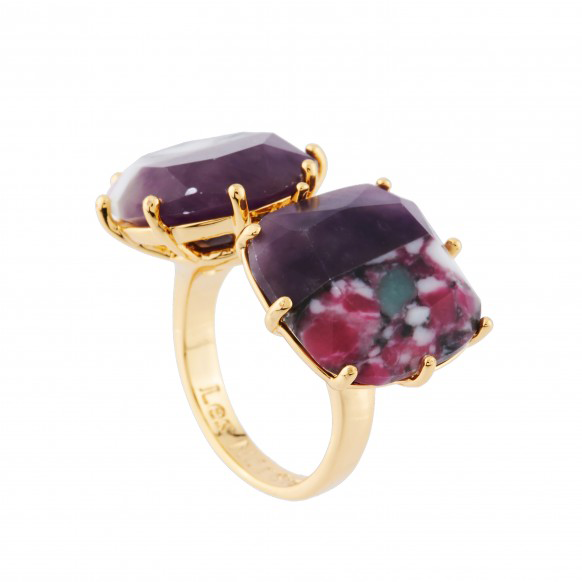 Anello della collezione diamantine dal color viola marmorizzato, una pietra è tonda ed una quadrata.