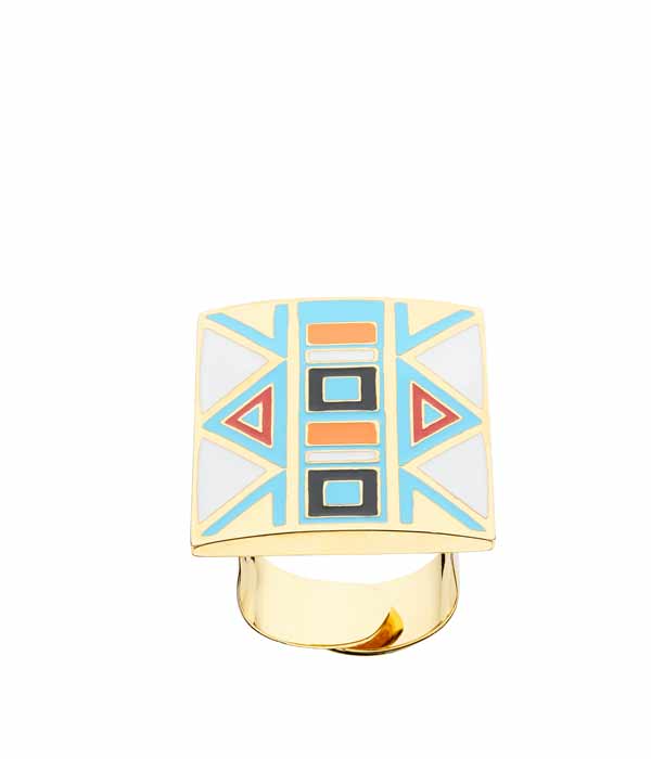 Una reinterpretazione dei motivi tradizionali messicano e dell'arte Maya per uno stile etnico e contemporaneo per una linea di bijoux grafica e moderna. Anello in intarsi smaltati dalle forme geometriche e colori vivaci su una base di metallo dorato.