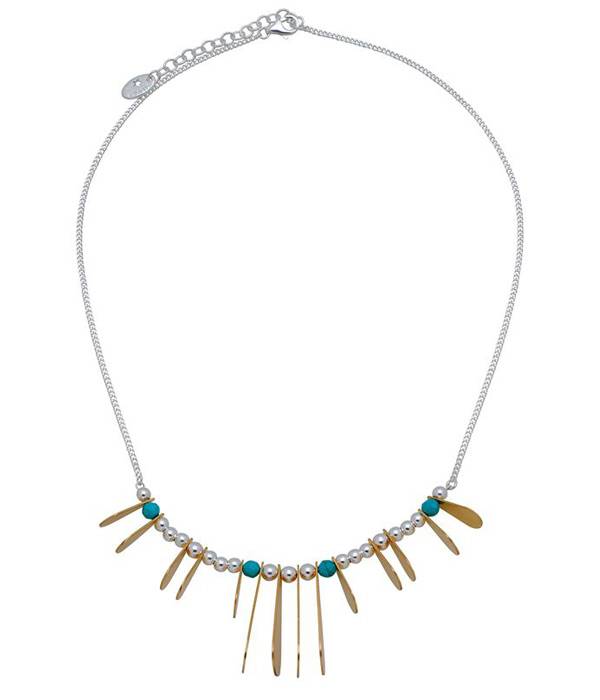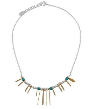 Collana in argento con pendagli a forma di goccia placcati in oro e piccole pietre color turchese.