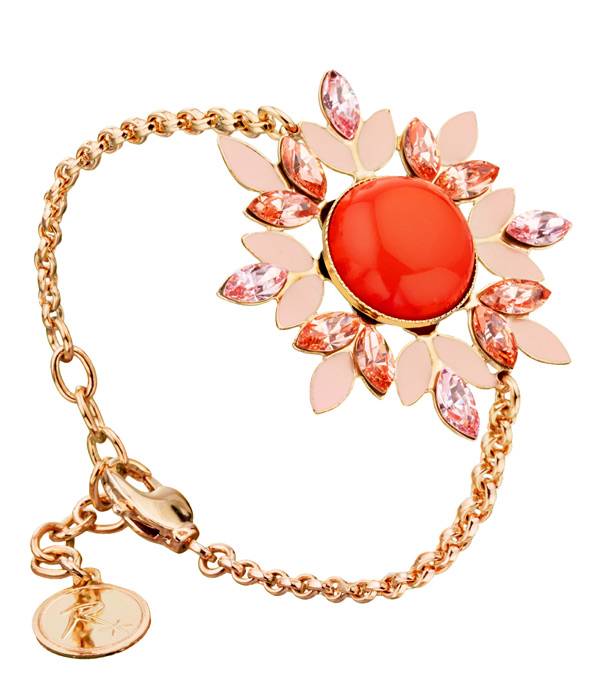 Bracciale in metallo di oro, tempestato di pietre e cristalli Marquise tagliato, il centro completata da un cabochon in resina nei toni nude e corallo per una gemma romantica.
