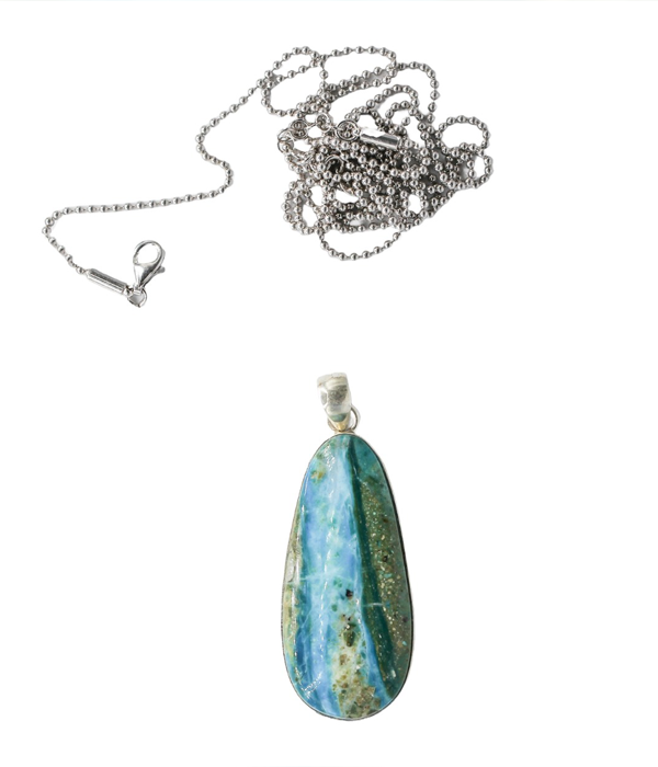 Il turchese, simbolo di protezione, si unisce alla crisocolla, rappresentante di serenità, alla malachite, associata alla crescita, e all'azzurrite, simbolo di chiarezza mentale. Questa combinazione di pietre preziose crea un caleidoscopio di colori e significati, rendendo il ciondolo non solo un accessorio di moda, ma anche un'espressione di connessione con la terra e con sé stessi.