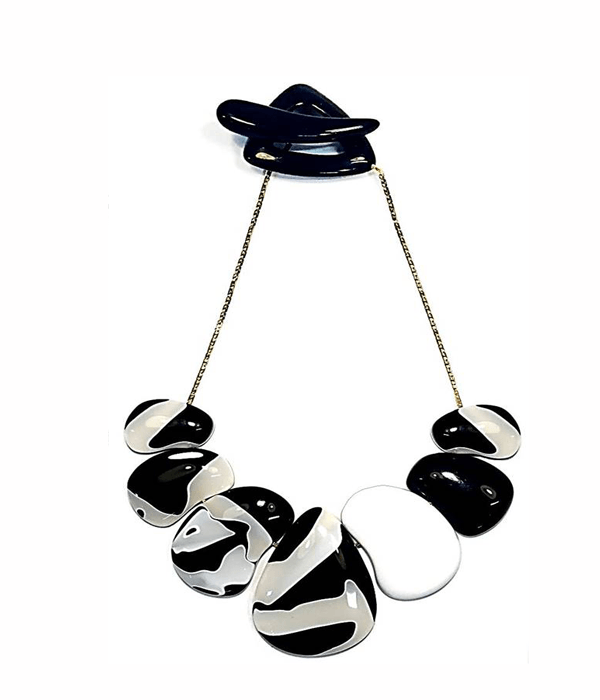 Collana a girocollo con forme a sassi in resina dai colori bianco e nero, dai toni moderni e dalle forme insolite per un effetto minimalista.