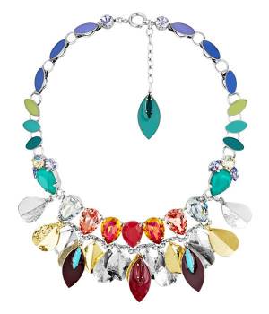 una collana di metallo, impreziosita da una successione di piume colorate dipinte di smalto,a forma di goccia di cristallo, marquise e pietre di vetro rotonde per un gioiello moderno.